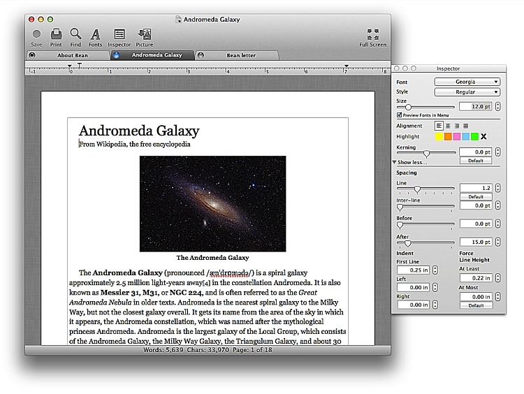 Bean in full screen mode with the Info Panel open. Alternate editing colors are turned on (white on blue here, but they are customizable).